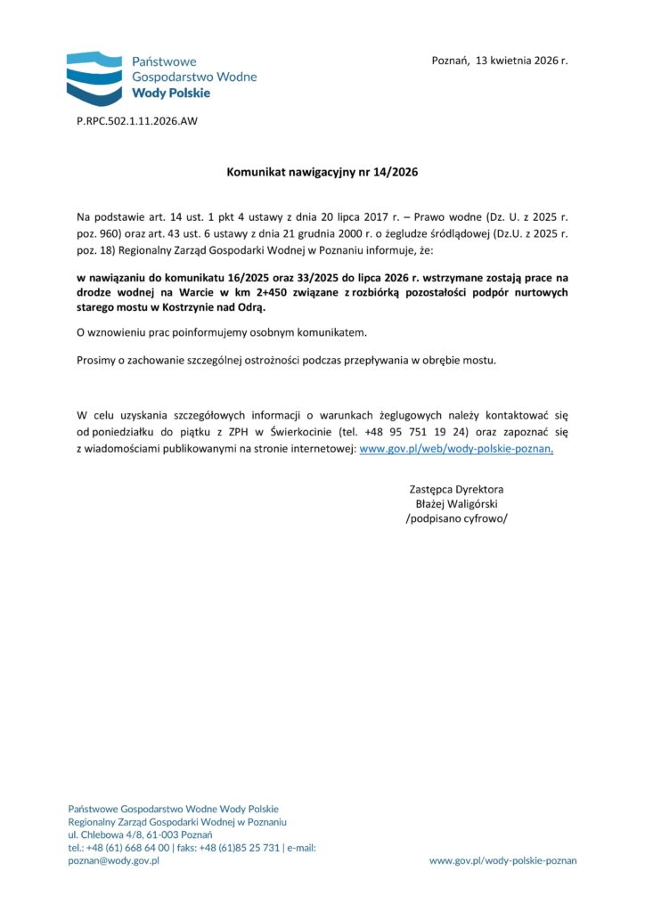 Komunikat nawigacyjny nr 14/2026 RZGW Poznań