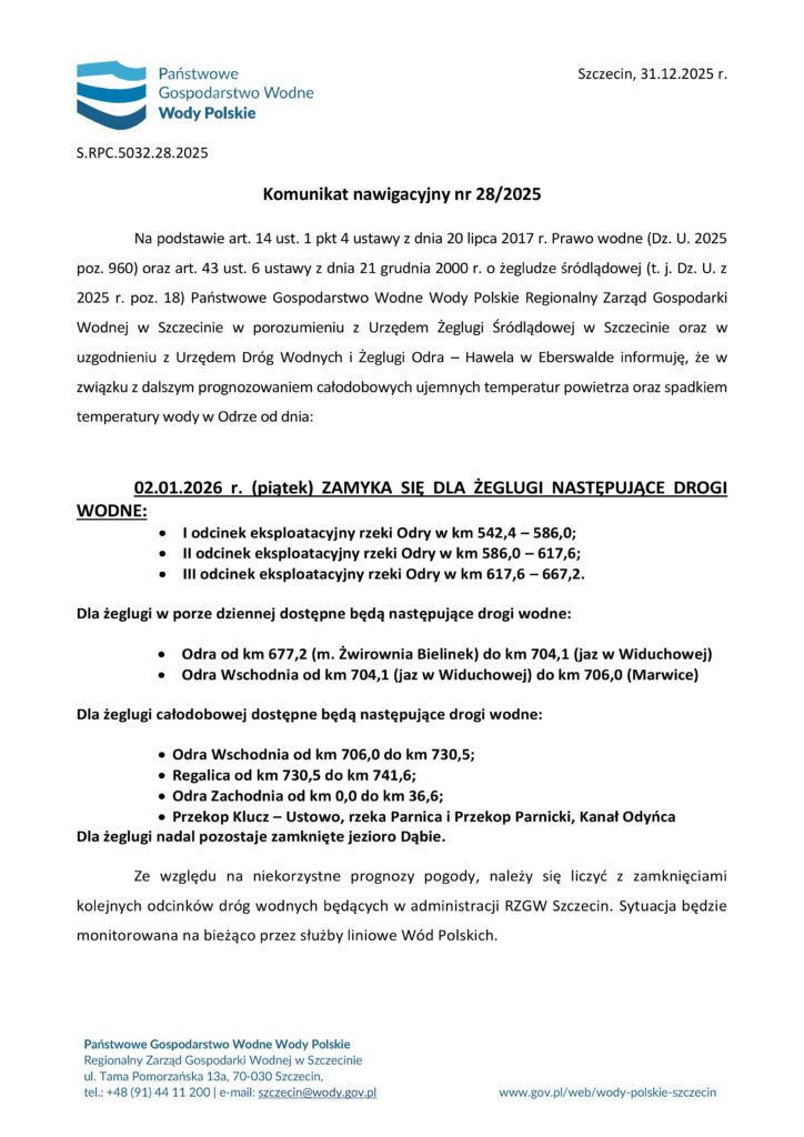Komunikat nawigacyjny nr 01/2026 RZGW Szczecin